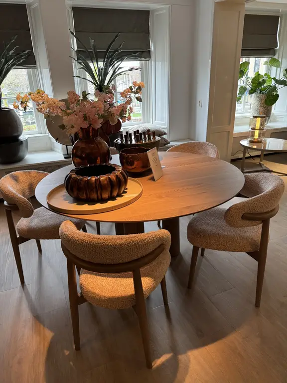Eetkamerset, bestaand uit een ronde tafel 150cm met 5 eetkamerstoelen van €5174,00 nu voor €3100,00